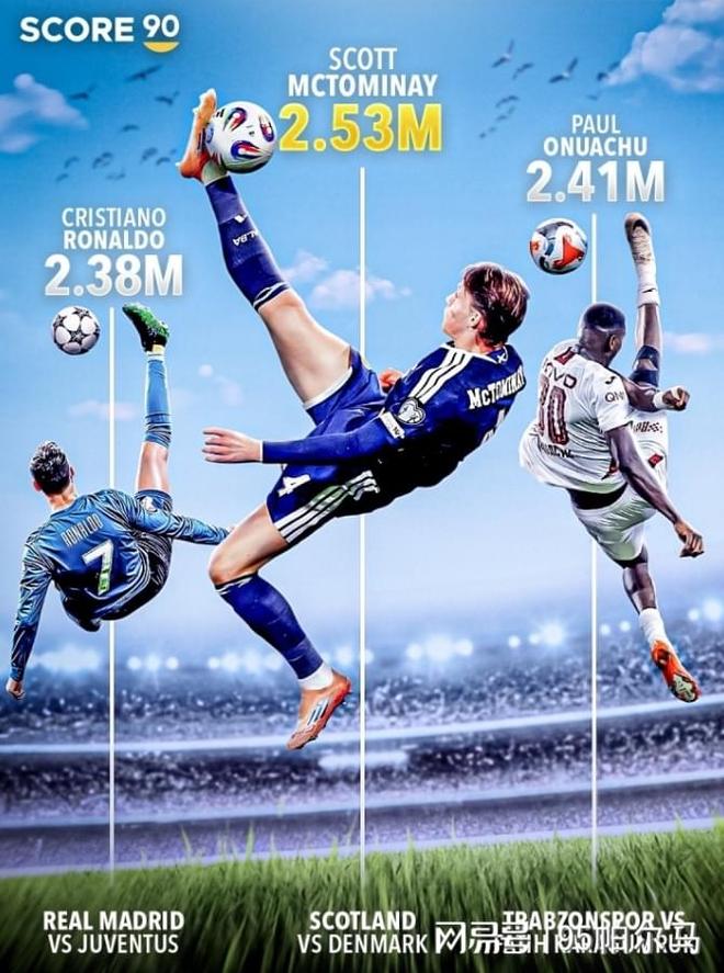 最近一次的英雄主义体现在对阵丹麦的世预赛中,苏格兰拿到了2026年世界杯资格,麦克托米奈打进了一粒美如画的倒钩,值得一提的是,他在倒钩瞬间脚尖高度达到了惊人的2.53米,超越了奥努阿楚的2.41米和C罗的2.38米,一举刷新了足球史上最高倒钩进球纪录。